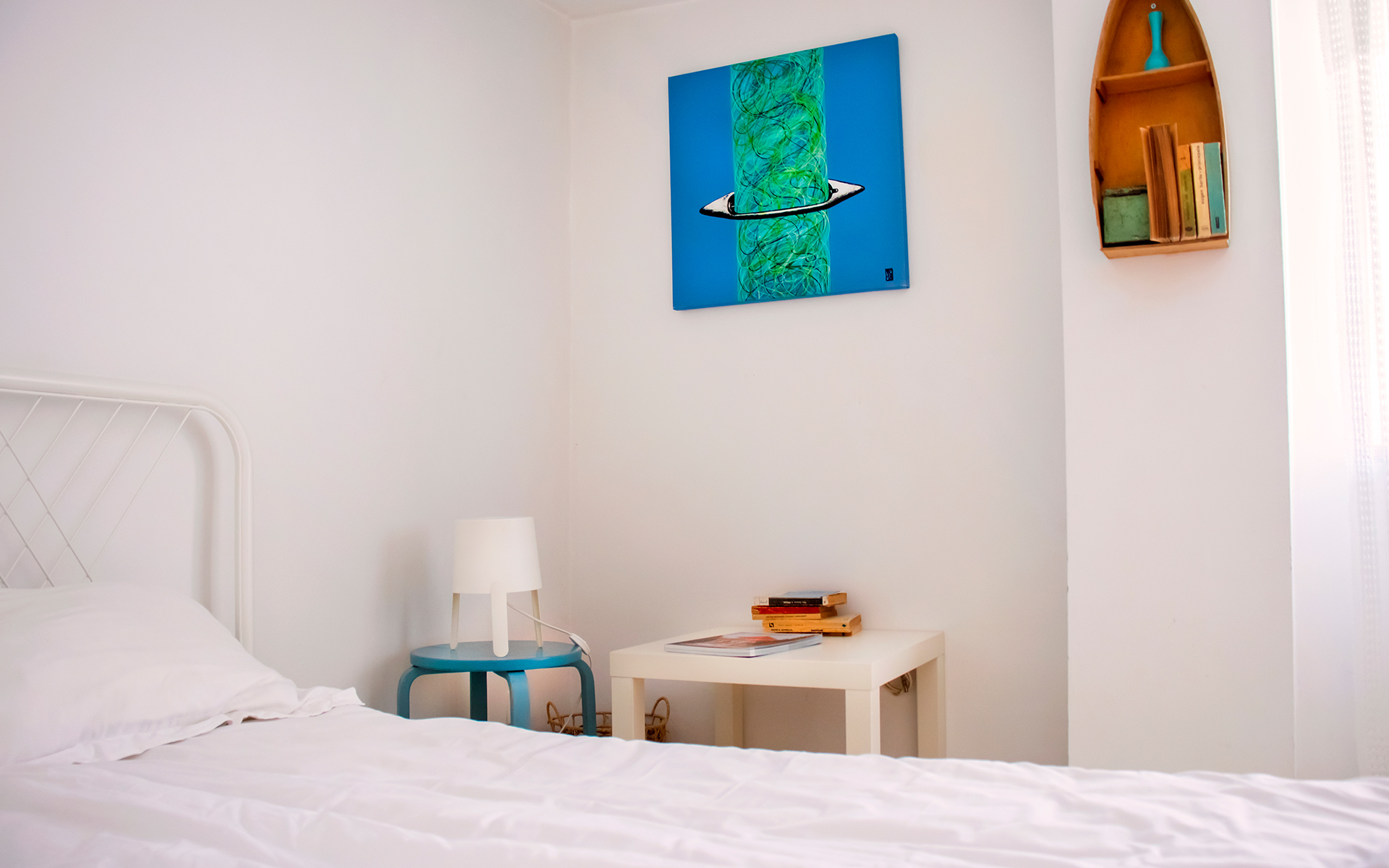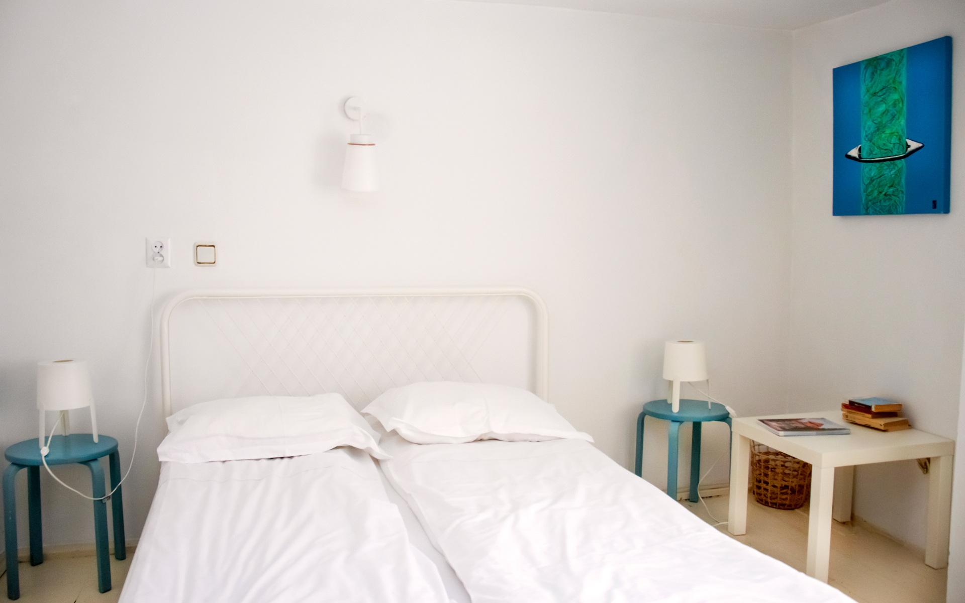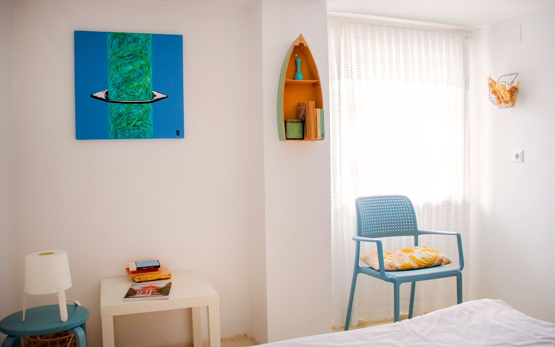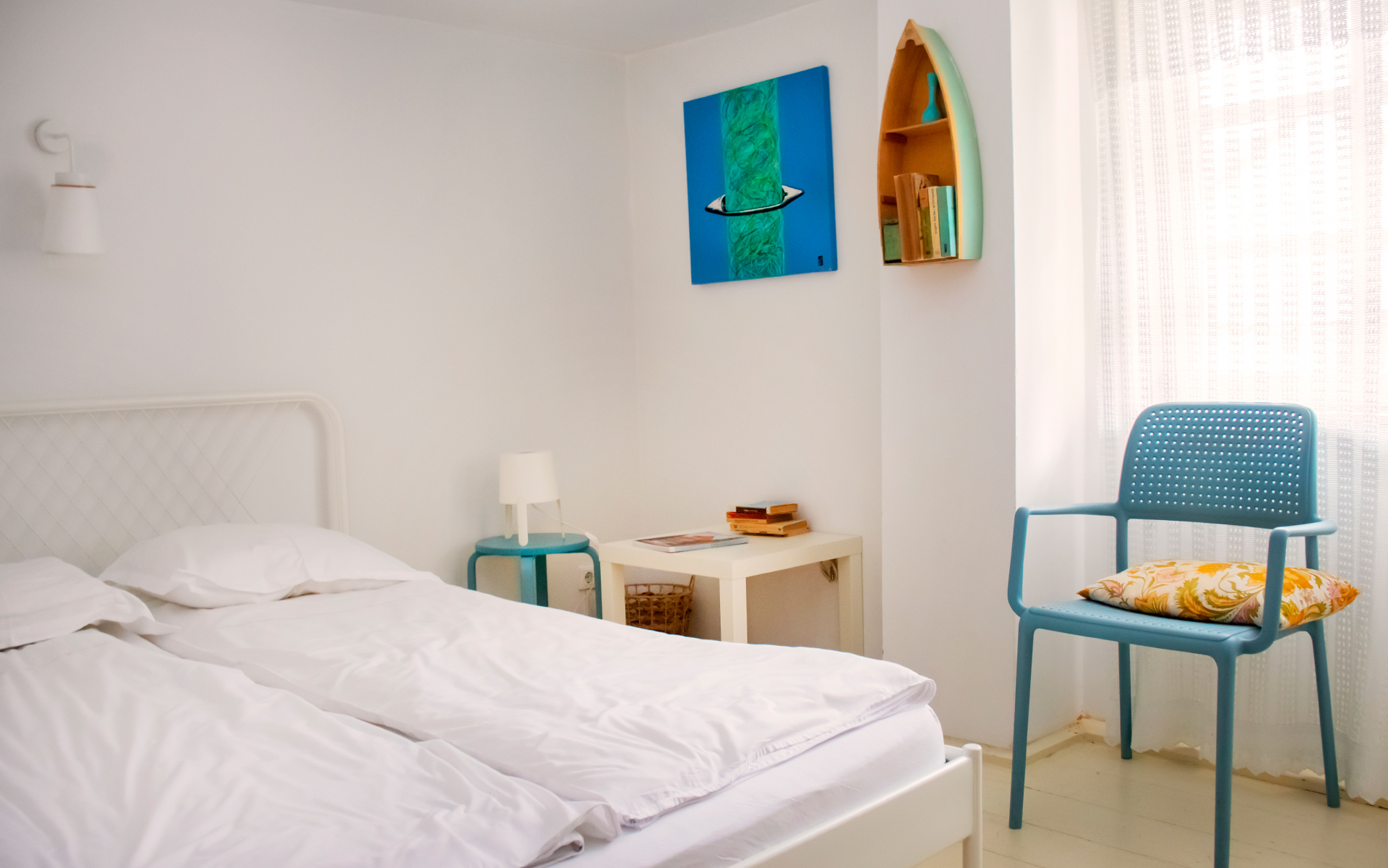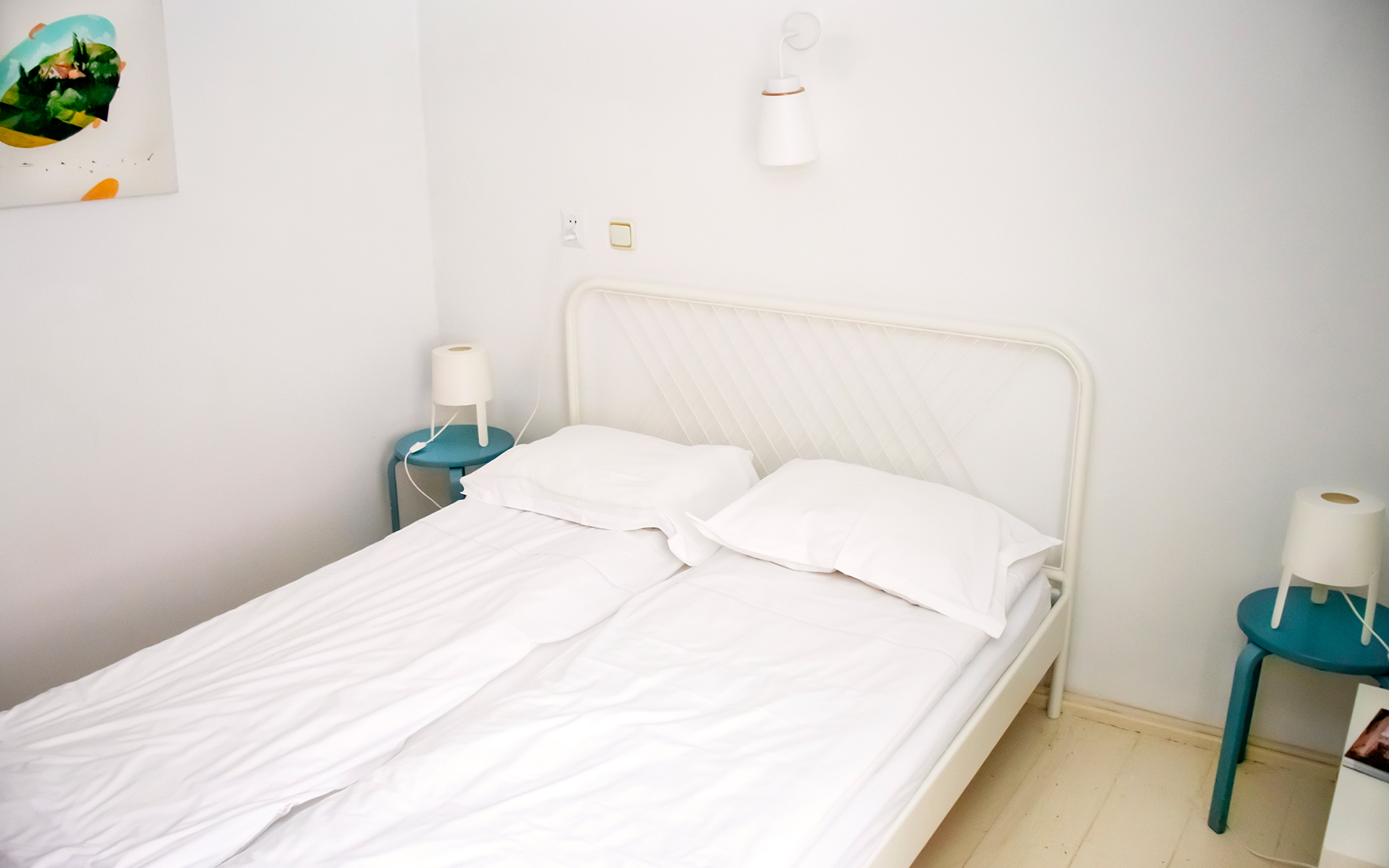 Ambianță caldă în camera cu pat matrimonial, prietenoasă și potrivită pentru toate categoriile de vârstă.